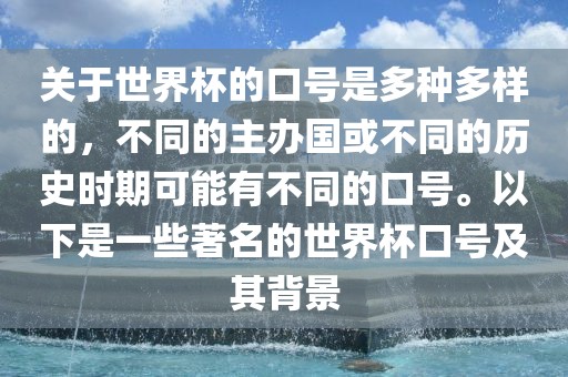 关于世界杯的口号是多种多样的,不同的主办国或不同的历史时期可能有不同的口号。以下是一些著名的世界杯口号及其背景