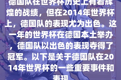 德国队在世界杯历史上有着辉煌的战绩,但在2014年世界杯上,德国队的表现尤为出色。这一年的世界杯在德国本土举办,德国队以出色的表现夺得了冠军。以下是关于德国队在2014年世界杯的一些重要事件和表现