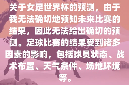 关于女足世界杯的预测,由于我无法确切地预知未来比赛的结果,因此无法给出确切的预测。足球比赛的结果受到诸多因素的影响,包括球员状态、战术布置、天气条件、场地环境等。