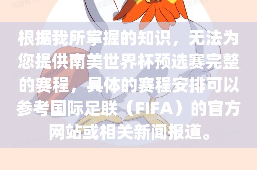 摘要:本文简要提及无法提供南美世界杯预选赛完整赛程的情况,建议读者可以参考国际足联的官方网站或关注相关新闻报道以获取具体的赛程安排。