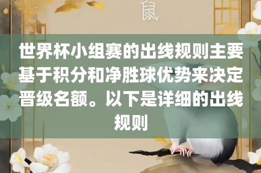 世界杯小组赛的出线规则主要基于积分和净胜球优势来决定晋级名额。以下是详细的出线规则