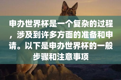 申办世界杯是一个复杂的过程,涉及到许多方面的准备和申请。以下是申办世界杯的一般步骤和注意事项