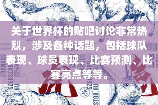 关于世界杯的贴吧讨论非常热烈,涉及各种话题,包括球队表现、球员表现、比赛预测、比赛亮点等等。
