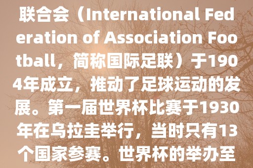 世界杯源自19世纪末的瑞士,随着足球运动的普及,国际足联于1904年成立。第一届世界杯比赛于1930年在乌拉圭举办,仅有13个国家参赛。世界杯历史已近百年,期间国际足联不断推动足球运动发展,并见证了许多重要里程碑和事件。