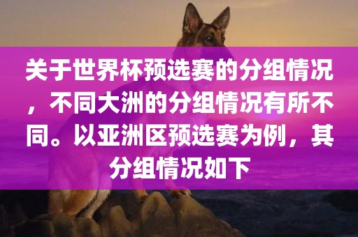 关于世界杯预选赛的分组情况,不同大洲的分组情况有所不同。以亚洲区预选赛为例,其分组情况如下