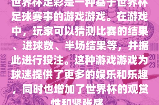 摘要:世界杯足彩是一种基于足球赛事的游戏,玩家可以通过猜测比赛结果、进球数和半场结果等进行投注。这种游戏为球迷提供了更多娱乐和乐趣,增加了世界杯的观赏性和紧张感。