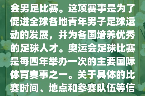 奥运足球世界杯是国际足联组织的U-23男子足球锦标赛,旨在促进全球青年男子足球运动的发展并为各国培养足球人才。该赛事每四年举办一次,是主要的国际体育赛事之一。关注国际足联官网或体育新闻网站可获取比赛时间、地点和参赛队伍等最新信息。
