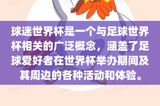 球迷世界杯是一个与足球世界杯相关的广泛概念,涵盖了足球爱好者在世界杯举办期间及其周边的各种活动和体验。