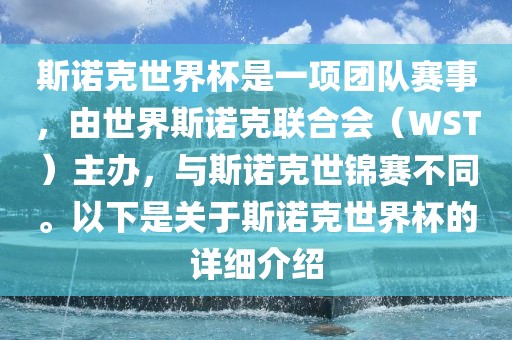 斯诺克世界杯是一项团队赛事,由世界斯诺克联合会(WST)主办,与斯诺克世锦赛不同。以下是关于斯诺克世界杯的详细介绍