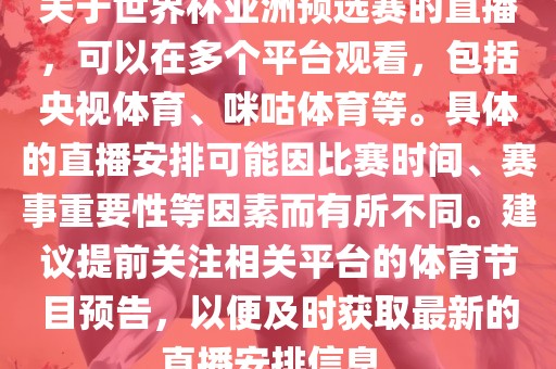 摘要:关于世界杯亚洲预选赛的直播,可在央视体育、咪咕体育等多个平台观看。直播安排因比赛时间、赛事重要性等因素可能有所不同,建议提前关注相关平台体育节目预告以获取最新直播信息。观看世界杯预选赛直播,感受比赛的激情与紧张氛围。