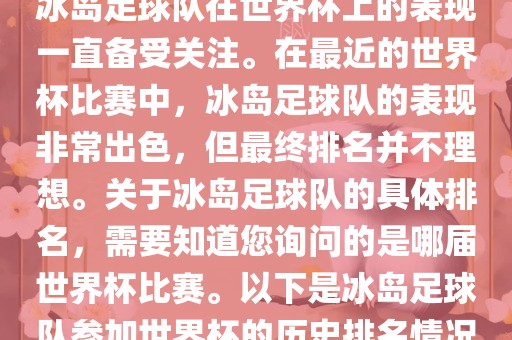 冰岛足球队在世界杯上的表现引人关注。尽管在最近的世界杯比赛中表现出色,但最终排名并不理想。关于其历史排名,需知道具体是哪届世界杯比赛。冰岛足球队在世界杯赛场上留下了深刻的足迹。