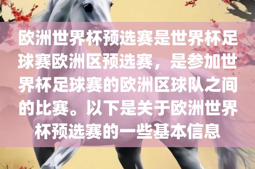 欧洲世界杯预选赛是参加世界杯足球赛的欧洲区球队之间的比赛,对于参加世界杯的欧洲足球队来说具有重要意义,通过预选赛,各队可以锻炼实力、积累经验,为参加世界杯做好准备。